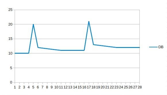Concernant l’augmentation des acouphènes elle est graduelle et se déroule en quatre phases, augmentation brusque de l’acouphène, redescente assez rapide dans les dix secondes puis il y a une sorte accoutumance et de diminution légère puis une stagnation jusqu’à la prochaine augmentation.Sachant que la durée de la stagnation dépend du niveau de pollution électromagnétique dans mon environnement immédiat, plus il est pollué, plus cette période est courte. Dans un graphique ça donne cela :