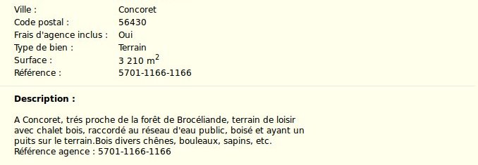 … enfin juste d’un bout de terrain ou je pourrais enfin pouvoir vivre normalement et que mon état se stabilise car jusqu’à maintenant il s’est toujours dégradé même si c’est de façon homéopathique. Donc me voila à la recherche sur les différents site de vente sur internet d’un terrain pas trop cher et en bonus avec un chalet ou un mobile home pour pouvoir m’abriter. Je finis par trouver quelque chose qui me semblais correct même si un peu cher dans le village de Concoret en Bretagne (enfin il va s’avérer que c’était clairement sur-coté).
