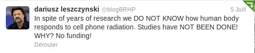traduction : En dépit d’années de recherche, nous ne connaissons pas les effets des radiations (non ionisantes) des téléphones portable sur le corps humain. Les études n’ont pas été faites, pourquoi ? Pas de fonds.
