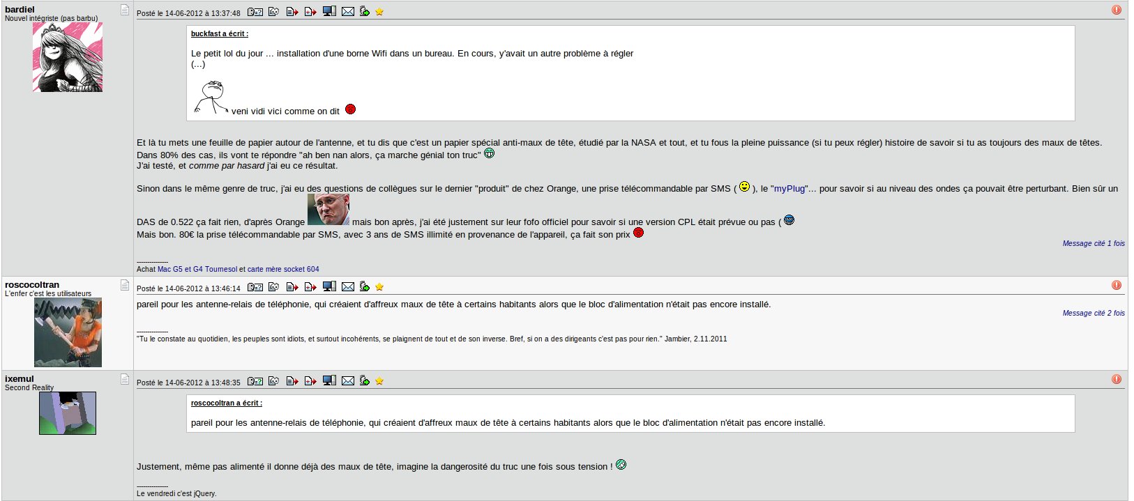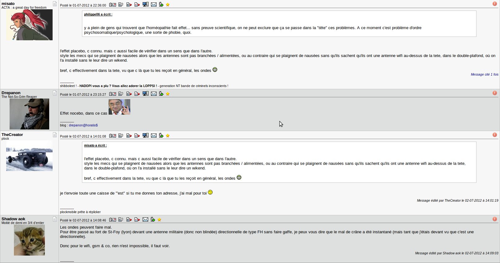 seul un poste accrédite un peu ce que je dit au sujet des Faisceaux Hertzien (FH) qui donnerait mal au crâne, en même temps quand on se met dans le faisceau d’une connexion point à point de plusieurs km ça doit défriser un peu les cheveux :)
