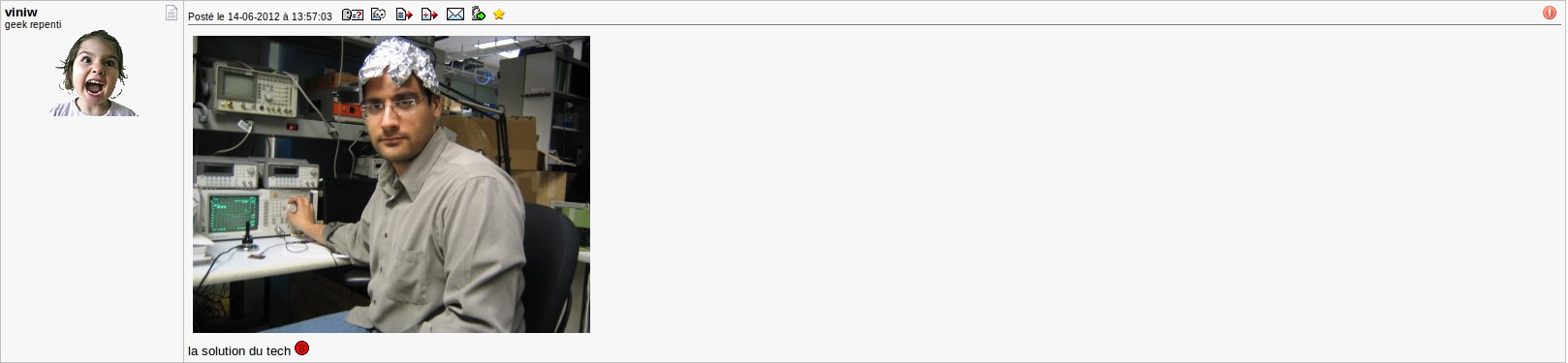 Avec en bonus une photo qui met bien en valeur notre maladie. Alors ça c’est un gros problème au niveau de notre « image de marque », c’est à dire que pour la plus part des gens nous sommes avec nos chapeaux en aluminium ou avec notre tissu anti-onde sur la tronche et c’est très mauvais car :