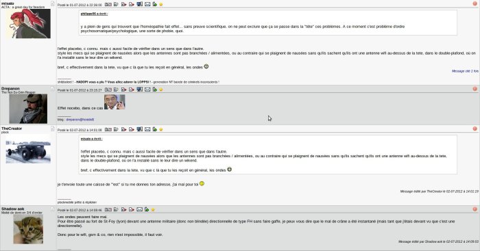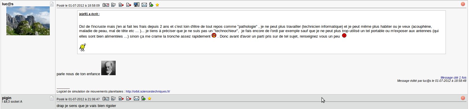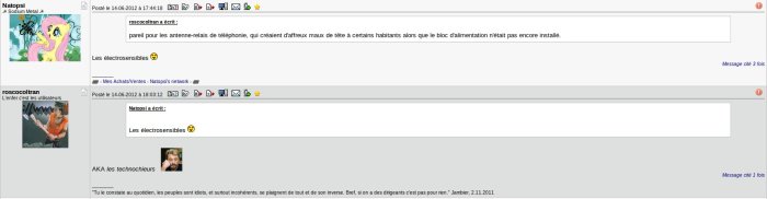 J’ai pris part à la conversation, parce que c’est bien gentil de se moquer d’une chose qu’ils sont incapable de juger puisque n’ayant jamais eu affaire a la problématique de l’électrosensibilité. Les premières réponses furent comment dire, courtes et digne d’un kikoulol (personne qui ne sait que dire : kikou, lol, mdr) :