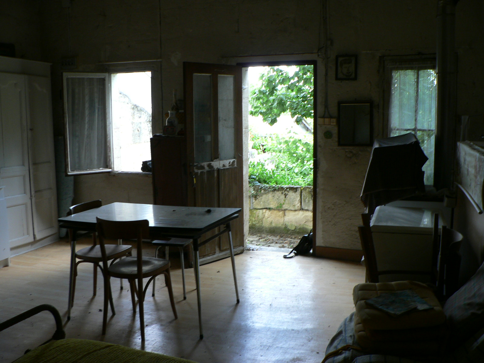 On passe ensuite à la partie du hangar qui est super grande, on pourrais rentrer un semi remorque si il y avait un accès vers l’extérieur, il est rempli de charbon pour une grosse partie et tout au bout c’est un bric à brac de divers choses, table, cave à vin etc … Il m’explique un peu l’histoire de cette habitat, qu’il servait à pressé les vignes dans des grands pressoir, il y a encore certain vestiges mais en très mauvais état.