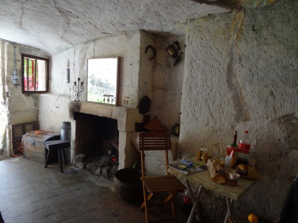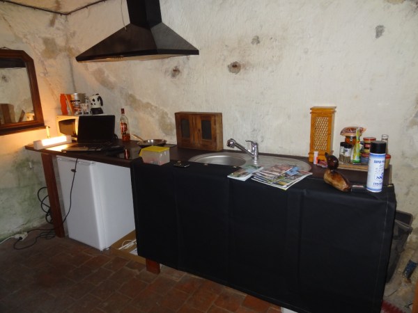 La je suis accueillis par le proprio, Aurélien, dés le début il commence à me présenter son troglodyte,il est composé d’une première pièce avec sur la droite un coin cheminé et sur la gauche le coin cuisine qui d’apparence était bien aménagé :