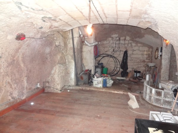 Après cette partie on tombe sur la pièce principale qui était encore en travaux, le début était composé des murs brut et le sol était recouvert d’une sorte de bois exotique dont je ne me souviens plus du nom. D’après ce que j’ai compris c’étais un bois qui était tellement dense qu’il n’était pas putréfiable car ce qui faut savoir dans un troglodyte c’est qu’il y a beaucoup d’humidité et que le bois à tendance à ce dilater en absorbant l’eau. Les spots encastré dans le parquet sont assez sympa, mais faut avouer que ça reste sombre.