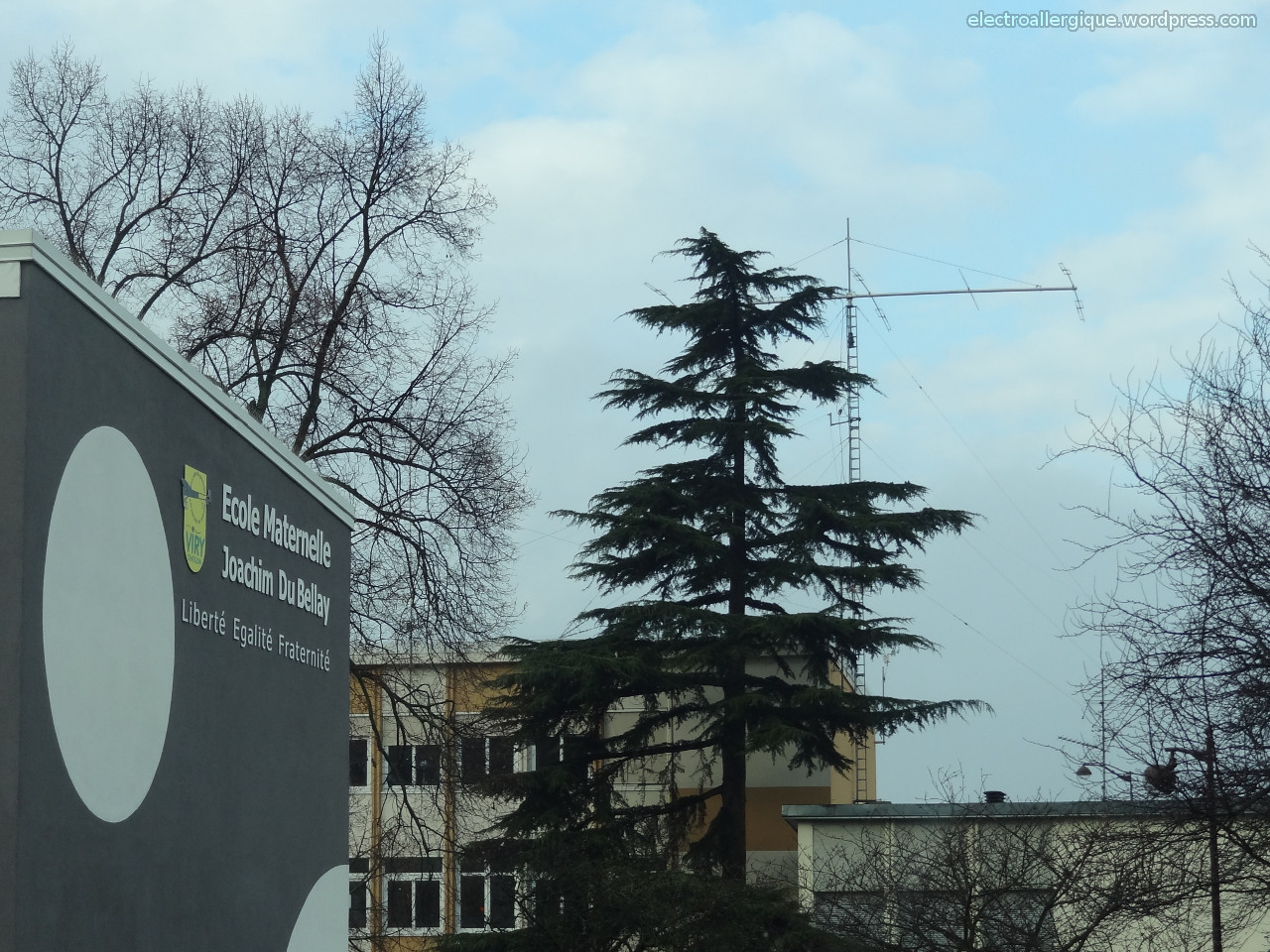 Voici un autre exemple dans la ville de Maringues, des antennes qui donnent directement sur la cours des enfants … (vous pouvez cliquer sur la photo pour accéder au site de Philippe LE PONT, Président de Bien Vivre à Maringues qui dénonce ces installations)