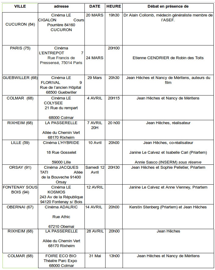 Maj 13/03/2014 : Voici les prochaines dates et lieux de projection de ce documentaire avec des débats à la fin avec diverse personnalités qui militent dans ce domaine.