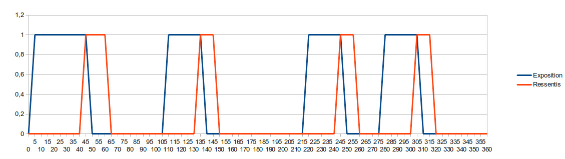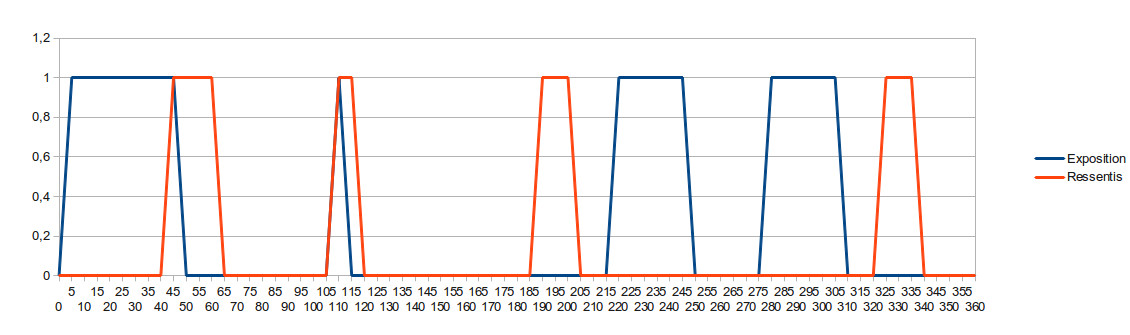 Dans un cas positif, on devrait retrouver le schéma suivant, c’est-à-dire qu’à partir d’un temps relativement identique le sujet devrait ressentir les effets des ondes, bien sûr dans la réalité, il sera nécessaire de mettre une marge.