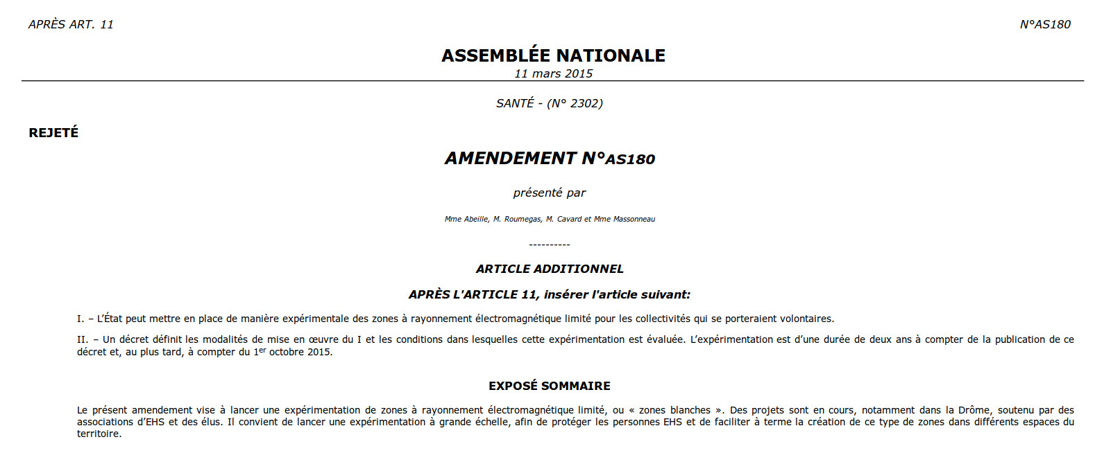 L’amendement AS180 avait pour but la mise en place de zone expérimentale à rayonnement électromagnétique limité aussi appelé zone blanche. Même si ça touche un nombre limité de personnes, l’électrosensibilité peut s’avérer très handicapant dans certaines conditions, voire invivable et l’opportunité de mettre en place ces zones dans des communes volontaires aurait pu être une opportunité pour ces malades pour qui la recherche d’un endroit sans exposition aux champs électromagnétiques où vivre est devenu un impératif. Il existe déjà un projet de la sorte mené par la député Michèle Rivasi mais il est en totale contradiction avec les objectifs de l’ARCEP pour qui la couverture totale de la métropole est une finalité sans qu’aucune exception ne soit faite.