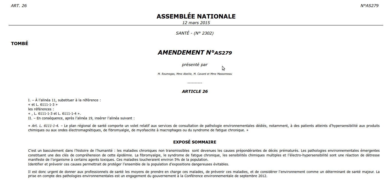 L’amendement AS279 quant à lui devait permettre d’ouvrir des consultations concernant les maladies émergentes comme la fibromyalgie, le syndrome de fatigue chronique, l’électrosensibilité ou encore la myofasciite à macrofages. Maladies qui sont, a priori, délaissées par le corps médical et dont aucune offre de prise en charge n’est actuellement disponible. Seuls quelques spécialistes comme le professeur Belpommes, en ce qui concerne l’électrosensibilité, se penche sur le sujet, mais avec quelques réserves car ses travaux sont à l’état de recherche et les critères retenus pour diagnostiquer les malades sont certainement à ajuster ce qui pourrait avoir pour conséquence d’avoir écarté certains malades à tort. De toute façon, l’amendement ne sera même pas discuté puisque l’article 26 de la proposition de loi a été complètement réécrit ce qui a comme conséquence pour cet amendement de « tomber » automatiquement.