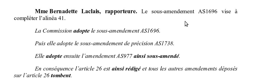 Le député Bapt quand à lui semble un peu plus pragmatique mais le plan national santé-environnement (P. 74) pour les années 2015-2019 ne fait aucune mention d’une quelconque élaboration d’une zone blanche. Il y a bien l’information concernant l’exposition aux champs électromagnétiques, la recherche à travers des appels à projet de l’ANSES mais ça se limite à ça pour le moment. Quant au projet de zone blanche de Michèle Rivasi, il semble qu’il y avait un problème car Bouygues télécoms avait remis en fonction des antennes relais dans les environs, de plus d’après les dernières nouvelles de l’association Une terre pour les EHS, un appel d’offre à la CAF qui est propriétaire des lieux est en cours mais rien ne garantie que le projet ira à son terme. Après 3 malheureuses petites minutes de discussion, le sort de cet amendement sera scellé, avis défavorable du rapporteur et rejet de l’amendement.