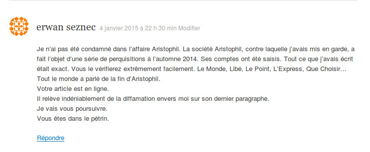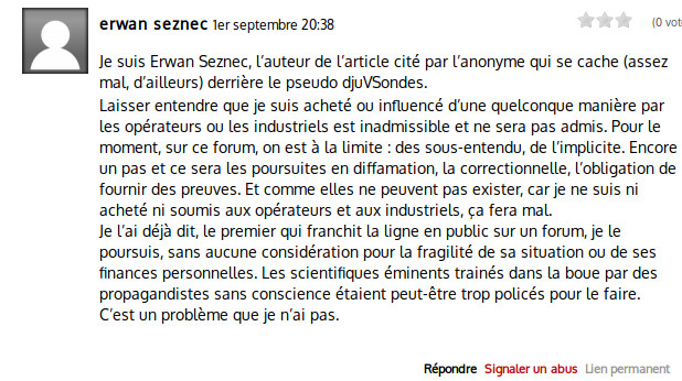Cette article a fait l’objet d’une critique sur AgoraVox et j’ai eu l’occasion de déposé des commentaires pour l’occasion. Et bien sûr, nous avons eu le droit à une réponse comme seul sait le faire le journaliste de Que Choisir, avec menace de dépôt de plainte pour qui remettrait en cause son intégrité, il ne faudrait pas perdre la main. En revanche je me sens un peu concerné quand ce journaliste évoque le peu d’empathie qu’il aura dans le cas de poursuites en ce qui concerne les considérations pour « la fragilité de sa situation ou de ses finances personnelles », et encore plus quand il parle des « propagandistes sans conscience », j’espère pour lui qu’il ne franchira pas la ligne non plus, car je ne sais pas s’il est au courant, mais il n’a pas le monopole des dépôts de plainte pour diffamation.