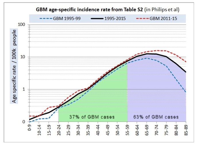 « Vous pouvez constater, que pour les glioblastomes, ignorer les cas des plus de 59 ans, élimine 63% de tous les cas d’Angleterre, » indiqua Alasdair Philips. « La hausse de ce type de tumeur est exclusivement dans ce groupe de personnes plus âgées, c’est la différence entre les lignes pointillées rouges et bleues. » Si nous avions éliminé ce groupe, nous aurions rejoint les conclusions de Ken Karipidis ».[à noter que le taux des GBM est tracé sur une échelle logarithmique. Pour voir le même graphique sur une échelle linéaire, vous pouvez aller ici].