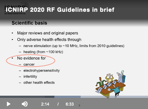 Le premier, nous vient d’Eric Van Rongen des Pays-Bas, l’actuel président de l’ICNIRP. Le Docteur Eric van Rongen a rendu public une présentation de 6 minutes sur la mise à jour des standards d’exposition aux hyperfréquences de sa commission, publiée il y a un mois de cela. À deux minutes de la présentation de son Powerpoint, on peut l’entendre dire, « Il n’y aucune preuve dans toutes les informations scientifiques qu’il y aurait une induction de cancer causé par les champs électromagnétiques de type hyperfréquences ».